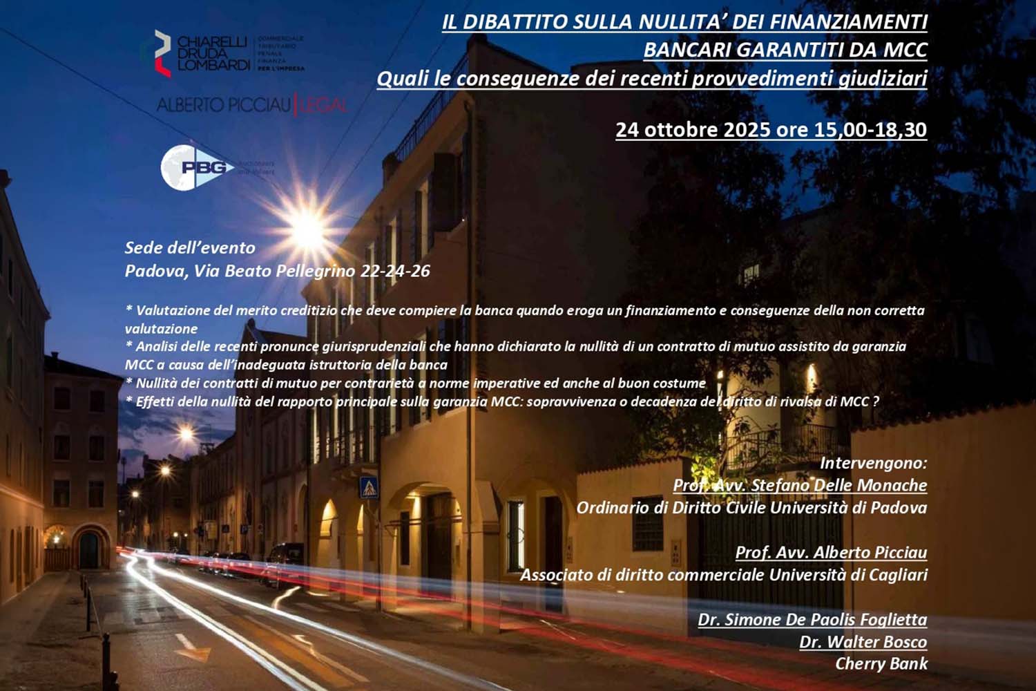 Venerdì 24 Ottobre 2025, dalle 15.00 alle 18.30, presso la sede dello Studio Chiarelli Druda Lombardi & Associati in Padova, Via Beato Pellegrino 22–24–26, si terrà un importante incontro di approfondimento dedicato al tema della nullità dei contratti di finanziamento bancario garantiti da MCC e alle implicazioni derivanti dalle più recenti pronunce giurisprudenziali.